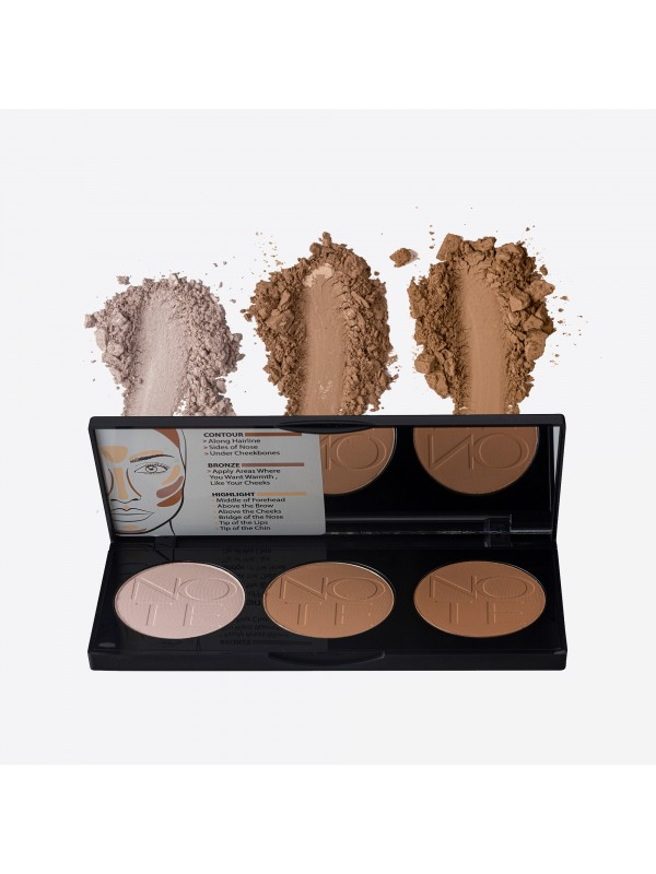 Evidențiază, conturează și iluminează cu paleta de contur Note Perfecting. Această paletă 3 în 1 conține o pudră de contur, o nuanță de bronzer și un iluminator pentru a crea un look perfect definit. Pudrele ușoare se topesc pe piele, oferind un finisaj mat catifelat și unul ușor strălucitor. Formula ușor de estompat conține ulei de argan și vitamina E, ajutând la hidratarea pielii în timp ce conturezi, subțiezi și adaugi strălucire.